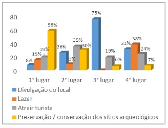 Um cenário de utilização do patrimônio arqueológico como atrativo turístico foi apresentado aos entrevistados, e diante da aceitação pediu-se que enumerassem os objetivos reais do desenvolvimento turístico, por ordem de prioridade. Embora com diferenças numéricas, as mesmas não se destoam de forma expressiva. Em primeiro lugar responderam que o principal objetivo consistia na preservação e conservação dos sítios arqueológicos, em segundo atrair turistas; em terceiro lugar a divulgação do local e, por fim o lazer. Um resultado bastante satisfatório, observando que a comunidade tem por prioridade a preservação dos sítios, frente às agressões que os mesmos vêm sofrendo há décadas.