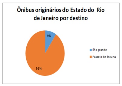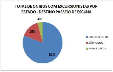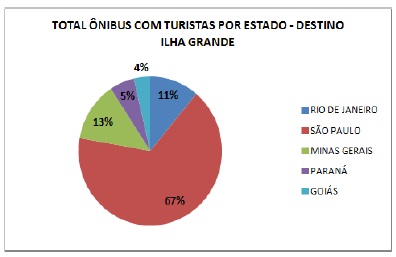 No caso do estado do Rio de Janeiro, 91% dos ônibus, conforme Gráfico 2, foram de visitantes excursionistas, ou seja, que passaram somente parte do dia na cidade. Nesse caso, todos eles destinaram-se a fazer passeio de escuna pela baía da Ilha Grande, de acordo com as entrevistas realizadas com os motoristas dos ônibus. Esse passeio leva, aproximadamente, 5 horas, visitando algumas ilhas e parando para almoço em uma delas. Na época da pesquisa, o valor do referido passeio, fixado pelas agências, era em média R$ 50,00, sem direito ao almoço. Ainda sobre o estado do Rio de Janeiro, os outros 9% corresponderam aos visitantes turistas, ou seja, que pernoitaram no município, especificamente na Ilha Grande.