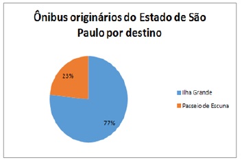 No que diz respeito ao Estado de São Paulo, do seu total de ônibus emitidos para Angra dos Reis [Gráfico 3], 77% foram de visitantes que se destinaram para a Ilha Grande, inclusive pernoitando nesse local, portanto correspondendo ao grupo denominado turistas. Os 23% restantes, foram visitantes excursionistas que realizaram passeio de escuna, ou seja, ficaram parte do dia no município. Nesse caso, por meio de entrevistas com os motoristas levantou-se a informação que grande parte desses excursionistas estavam dirigindo-se a, ou retornando de, outra localidade, sendo a parada em Angra dos Reis e o passeio de escuna, parte de um roteiro maior. Esses eram ônibus fretados para realizar o trajeto entre as cidades do estado de São Paulo e as seguintes localidades turísticas: Rio de Janeiro, Armação de Búzios [RJ], Cabo Frio [RJ].
