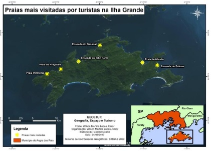 No que se refere propriamente aos turistas que se dirigiram para a Ilha Grande, diagnosticou-se quais a praias contempladas para hospedagem por eles. As praias - localidades foram as seguintes: Praia do Abraão, Enseada de Palmas, Enseada do Bananal, Enseada do Sítio Forte, Praia de Araçatiba, Praia Vermelha. A partir dessas informações obtidas por meio de entrevistas, elaborou-se a Figura 4.