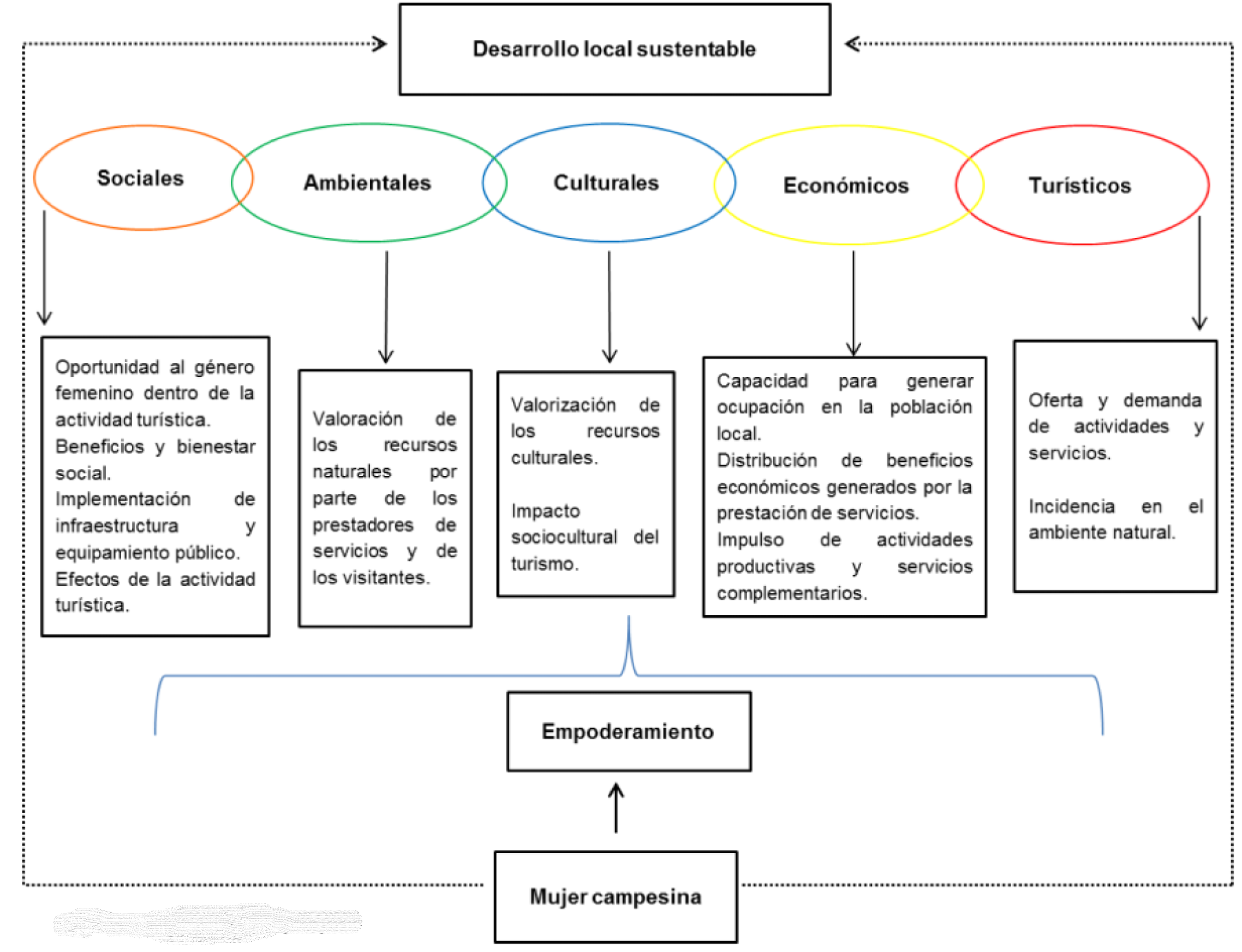 En la Figura se muestra a la mujer campesina como pilar para llevar a cabo la actividad turística y conservación ambiental donde, a partir de su participación y su empoderamiento desde diferentes variables, consigue las bases para forjar un desarrollo local sustentable. De esta manera, por las diversas dimensiones que abarca, se considera desde la perspectiva de sistemas complejos a partir de las esferas económica, socio-cultural, ecológica, ambiental y, un análisis del turismo rural desempeñado por la mujer campesina desde las variables de actividades y servicios, ocupación local, valoración de los recursos naturales y culturales, distribución de beneficios, mejoras en la infraestructura y equipamiento local además de los efectos colaterales que genera la actividad turística respecto a las condiciones de la mujer campesina. Así mismo, se consideró el análisis del aprovechamiento sustentable de recursos naturales a partir del sentido de pertenencia, las políticas de manejo establecidas por los propios actores locales y diversas instituciones, además del impacto ambiental que genera la actividad.