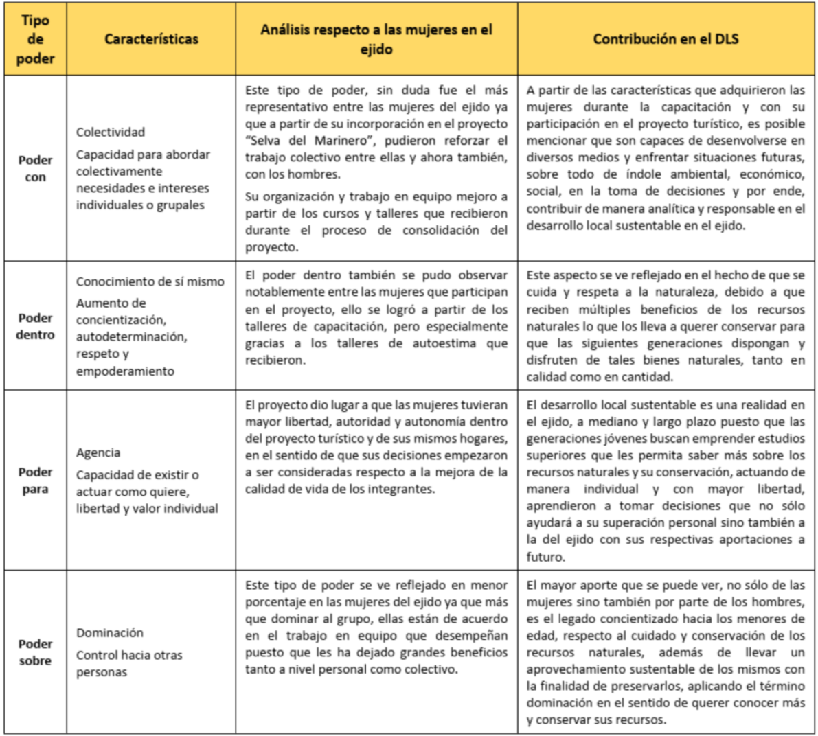Del mismo grupo, sólo dos de ellas han llegado a ser guía de turistas del proyecto sin embrago, no continuaron en dicho cargo debido a que les gusto más formar parte de las ‘anfitrionas’. Una de ellas abandonó ambos grupos debido a una oportunidad de trabajo fuera del ejido mientras que la otra, además de formar parte de la comisión de alimentación fue considerada por integrantes del proyecto y del ejido en general para tomar cursos sobre ‘primeros auxilios’ por lo que, temporalmente, fungió como partera y en el ejido y en lugares aledaños. De esta manera y con base a los resultados de la investigación, es posible identificar las características del tipo de empoderamiento de la mujer campesina en el ejido ALM y su contribución en el desarrollo local sustentable [DLS], ello se observa en el Cuadro 1.