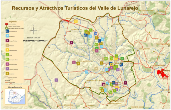 Este artículo está centrado en el análisis de las tensiones existentes entre el desarrollo turístico y la conservación ambiental, tomando como caso de estudio del área protegida [en adelante AP] Paisaje Protegido Valle del Lunarejo, ubicado en el noroeste del departamento de Rivera, Uruguay. Incluye 30.000 hectáreas de propiedad privada y del Instituto Nacional de Colonización, que desde el año 2001 cuentan con protección municipal (Ciedur, 2013). En el año 2001 la Cuenca del Arroyo Lunarejo es declarada como área protegida departamental. Este proceso luego se fortalece con el ingreso del Valle del Lunarejo al Sistema Nacional de Áreas Protegidas [SNAP] en el 2009, bajo la categoría de Paisaje Protegido.