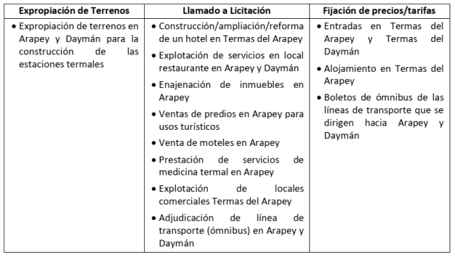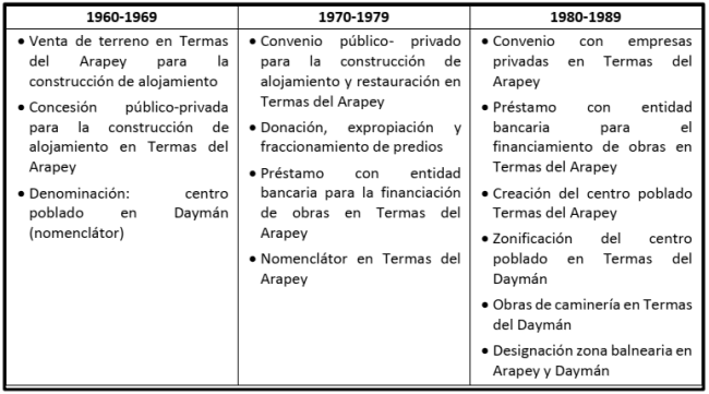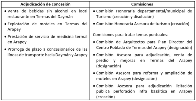 Decretos de la Junta Departamental de Salto - La Junta Departamental de Salto ha elaborado Decretos que se vinculan con los centros termales de Arapey y Daymán desde fines de la década del 50 del siglo XX. Gran parte de los decretos que hacen referencia a las Termas del Arapey y Daymán implican autorizaciones, anuencia de la Junta Departamental de Salto [o de la Junta de Vecinos de Salto] al Concejo Departamental de Salto, Intendencia Municipal de Salto o Intendencia de Salto [el nombre del gobierno departamental varía dependiendo del período histórico de referencia]. Se puede constatar que en general es la Intendencia quien remite a la Junta Departamental de Salto los proyectos de decretos para ser aprobados por la Junta. El primer decreto identificado de la Junta Departamental de Salto en relación a la conformación de los balnearios, refieren específicamente a las Termas del Daymán y data del año 1958. Durante el período 1960-1989 [según décadas] la Junta Departamental de Salto [JDS] promulga decretos que se centran en los siguientes aspectos: