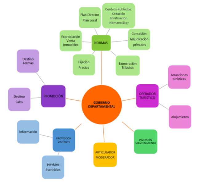 Rol del gobierno departamental en las Termas de Arapey y Daymán - El papel del Estado ha sido fundamental a nivel local pero también a nivel nacional en la construcción del país turístico; aunque, han sido los capitales particulares los que debieron sustituir al Estado en áreas en las cuales éste no intervenía, y los que fueron protagonistas de la génesis del Turismo de Uruguay: “El Estado terminó por asumir prácticamente todas las funciones: fue constructor de caminos y de vías férreas, promotor, hotelero, prestamista, transportista, regulador, explotador de juegos de azar, guardián de la calidad de vida, aguatero, iluminador” (Jacob, 2000, p. 60). Entre las principales funciones que le competen al gobierno departamental de Salto en relación al producto turístico termal se pueden destacar: crear y asegurar el cumplimiento de las normas, funciones propias de un oferente turístico, articulador/moderador con los operadores turísticos, realizar la promoción del Destino Termas y proteger al visitante