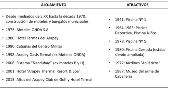 Entonces, se podría decir que desde la década de 1950 ya existían los primeros alojamientos para los visitantes y según la información disponible en el informe de la OEA se puede tener la certeza que en 1978 estaban construidas todas las categorías de moteles y bungalós municipales. En esa época la oferta de alojamiento en Termas de Arapey se compone principalmente de moteles y bungalós municipales de diferentes categorías: Moteles “A”, Moteles “B”, Moteles “D”, Moteles “F”, Moteles “H”, Motel colectivo, Bungalows “A”, Bungalows “B” especial, Bungalows “B” y camping. El único alojamiento ofertado por una empresa privada [pero en un predio de propiedad de la Intendencia Municipal de Salto] son los moteles construidos por la empresa Onda S.A. (OEA, 1978). Actualmente, en el complejo Termal de Arapey la oferta de moteles de propiedad de la Intendencia de Salto está formada por los moteles: Espinillo [ex Moteles “A”], Timbó [ex moteles “C”], Grevillea [ex Moteles “D”] y Sistema Ñandubay [ex moteles “B” y “H”]. Los nombres que llevan los mismos aluden en su mayoría a la flora autóctona de Uruguay. La oferta actual de bungalós lleva los nombres de algunas especies del monte indígena o nativo de Uruguay: Ibiriapitá [ex Bungalows “A”] y Anacahuita [ex Bungalows “B”].
