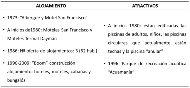 En el informe del año 1981 realizado por la OMT, se hace una descripción somera de las Termas del Daymán y se puede apreciar que el desarrollo del producto turístico a principios de la década de 1980, aún estaba en ciernes: “No existen instalaciones de alojamiento propiamente balnearias, sino solamente dos moteles situados en las cercanías y de escasa capacidad. Uno de los moteles cuenta con una piscina de su propiedad” (OMT, 1981). Teniendo en cuenta la oferta del momento, aunque, no se mencionan los nombres de los moteles y en base a la entrevista realizada a un informante calificado y al reporte periodístico de un diario local (El Pueblo, 28/10/1973), los moteles que existían hasta principios de 1980 eran: los moteles San Francisco y los Moteles Termal Daymán. En el año 1986 la oferta de alojamiento aún sigue siendo limitada: