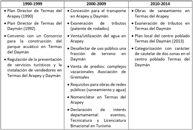 En la primera década de este siglo se destacan la consultoría realizada en el 2006 con la finalidad de mejorar la competitividad de los destinos turísticos de Uruguay, en la que se incluye el Corredor Termal [Salto-Paysandú] (Ros D&P, 2006). Por otro lado, en el año 2009 el Ministerio de Turismo aprueba ‘Plan Nacional de Turismo Sostenible 2009-2020’. En dicho plan se considera como una de las debilidades del sector turístico uruguayo la gestión y planificación del manejo de las aguas termales (Minturd-Bid, 2009). Atendiendo a la debilidad detectada en el Plan Nacional, se propone un plan estratégico y de acción que contribuya al desarrollo de la actividad termal durante el período 2010-2014 (QI/Iber-Geo, 2010); se pretende mejorar la competitividad de los destinos turísticos presentándose un plan operativo para los centros termales (Scarone, 2011). Por último, el Ministerio de Vivienda Desarrollo Territorial y Medio Ambiente, en conjunto con la Intendencia de Salto, realiza un informe sobre el centro poblado turístico Termas del Daymán con miras al turismo sostenible, en el que se trabaja sobre la dimensión ambiental del desarrollo (Mvtoma-IdeS, 2013).