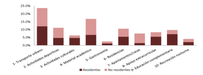 En Salto y concomitantemente con los centros universitarios se han desatado nuevas dinámicas, como el movimiento de capital para infraestructura en alojamientos [torres, residencias y habitaciones en casas de familia], el estipendio mensual de los alumnos que se trasladan a Salto y los recursos de funcionamiento de las instituciones. El movimiento educativo implica en la ciudad no menos de un millón y medio de dólares mensuales, promueve la formación de diversidad de profesionales, enriquece la cultura, estilos de vida y formas de convivencia de las poblaciones y estudiante (Noboa & Robaina, 2017). Según un análisis realizado en Salto (Forrisi Mugerza, Medin, et. al 2016), estudian en Salto unos 2.000 jóvenes que no residían en dicha localidad previo al inicio de sus vidas universitarias y 1.600 estudiantes salteños que hubiesen migrado a Montevideo de no dictarse su carrera en la ciudad. El mismo estudio plantea aspectos a mejorar y mucho de lo identificado por los estudiantes, tiene su correlato en componentes del turismo [alojamiento, recreación, transporte, gastronomía] como se aprecia en el gráfico extraído del trabajo aludido.