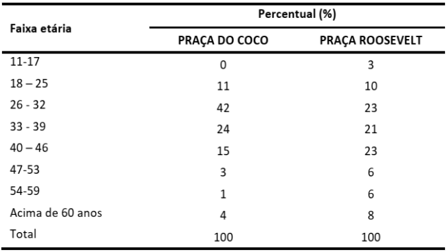Há muitas razões para isso acontecer, a primeira delas é a localização. A Praça Roosevelt está localizada no centro da cidade de São Paulo, enquanto que a Praça do Coco está em um distrito da cidade de Campinas, o que dificulta a frequência de outras pessoas que não moram ali. Outro ponto importante diz respeito ao espaço. A Praça do Coco sendo menor que a Praça Roosevelt não consegue acolher muitos moradores e visitantes. Contudo, é importante ressaltar que, em ambas praças a maioria expressiva de pessoas está concentrada na faixa etária entre 26 e 39 anos, expondo a concentração de jovens frequentadores. Na Praça do Coco há muitas crianças, mães, frequentadores do quiosque e eventualmente grupos de pessoas que andam de bicicleta; na Praça Roosevelt no mesmo espaço convivem skatistas, os que andam de patins e frequentadores e trabalhadores dos teatros e bares. Outro dado relevante que pode ser observado é que ambas as praças são frequentadas por pessoas de faixas de idades visivelmente distintas, crianças pequenas, pré-adolescentes e idosos enxergam nestas praças espaços comuns para se frequentar. Segundo Jacobs (2000), quanto mais diversificado for o espaço mais pessoas de diferentes grupos sociais o frequentarão.