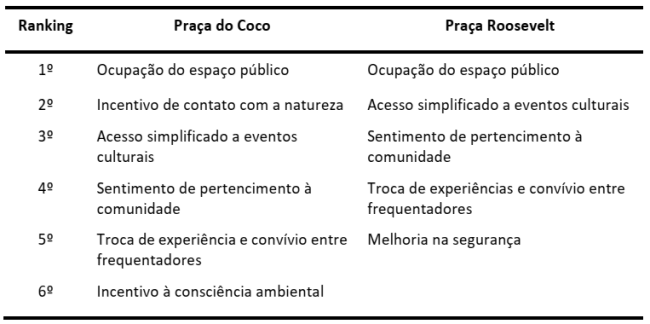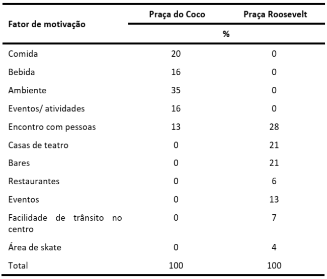 Em se tratando da motivação de frequência, evidencia-se a função original da praça: trocas culturais, comerciais e sociais. Na do Coco, a maioria das pessoas sinalizou ir ao local pelo ambiente, pela comida e pelo encontro entre pessoas. Já na Roosevelt, o destaque foi o encontro, depois as casas de teatro e os bares, características que apontam o grau de identificação das pessoas com as praças, sendo uma para atividades diurnas e outra noturna. No Quadro 2, indica-se a motivação da frequência as praças. Nota-se que ambas são vistas como referências de atividades culturais, e que buscam se diferenciar pelo ambiente [Praça do Coco] ou pela presença das casas de teatro [Praça Roosevelt]. A sociabilidade, a comensalidade, o ritual de se relacionar com o outro, seja ele um estranho ou não, motiva as pessoas a frequentá-las.