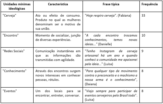 Além das postagens no perfil, três integrantes do grupo também foram entrevistadas. Observamos na composição das integrantes, a existência das cervejeiras que fabricam e produzem cerveja, a cervejeira que degusta e a cervejeira que estuda buscando conhecimento teórico. Selecionamos algumas das categorias mais significativas presentes nessas entrevistas através do recurso metodológico de mapeamento pela posição e sentido das palavras no texto, além de sua redundância (Barthes, 1980; Velho, 1973). Para todos os efeitos, toma-se Velho (1973), como modelo de análise de categorias. Sistematizam-se no Quadro 1, as Unidades Mínimas Ideológicas, suas características, assim como também suas frases mais significativas e frequência.