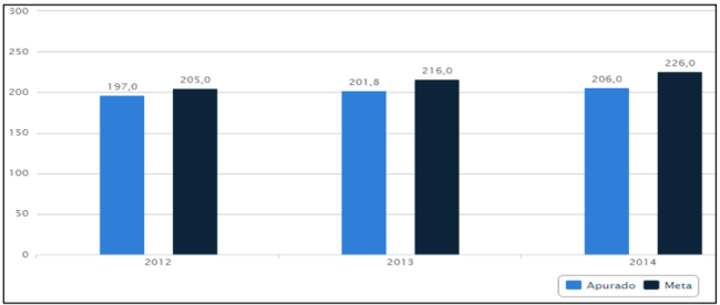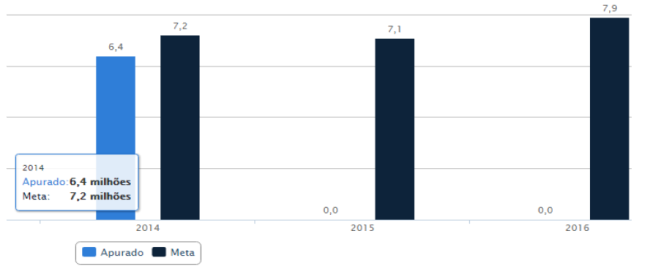Tanto as estimativas da iniciativa privada quanto dos órgãos públicos brasileiros não se concretizaram, conforme apurado no site de monitoramento do Plano Nacional de Turismo (Brasil, 2017a). A meta de 7,2 milhões de visitantes não foi atingida. Somente 6,4 milhões de visitantes foram contabilizados (gráfico 3).