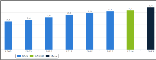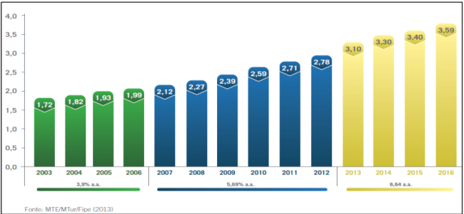 Ocupações formais até 2016 - Referente à Meta 5 [aumentar para 3,6 milhões as ocupações formais no setor de turismo até 2016], previa-se que o desenvolvimento do turismo seria “um dos maiores legados dos megaeventos com o impulso nas atividades econômicas, com aproximadamente 800 mil pessoas ocupadas até 2016, elevando a ocupação de 2,78 milhões para 3,59 milhões, com crescimento anual de 6,64%” (Brasil, 2013, p.77). A estimativa de empregos, em milhões, é apresentada no gráfico 6 a seguir.