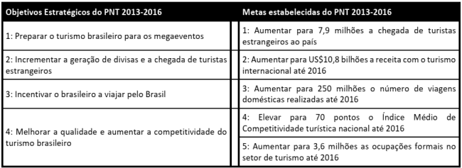 No Plano Nacional de Turismo [PNT] destacam-se o seu histórico e seus principais objetivos e metas, estabelecidos para o período 2013-2016. De acordo com Vieira (2007),