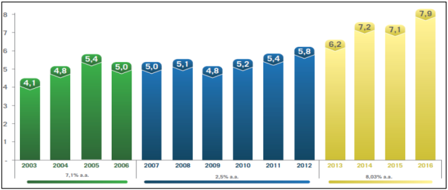 Número de turistas internacionais - Quanto ao fluxo turístico internacional para o país, resgata-se tal informação do documento: “dados apontam que foram 5,8 milhões de chegadas ao Brasil em 2012, e que a perspectiva é de melhoria no médio prazo, aproveitando a visibilidade dos megaeventos esportivos realizados” (Brasil, 2013, p.31). O Gráfico 1 representa as estimativas de crescimento gradativo do fluxo de turistas internacionais, de acordo com o PNT, justificadas por dois fatores: (I) recuperação da economia dos países fronteiriços e (II) realização dos megaeventos, projetando taxa média de 8,03% ao ano, até atingir os 7,9 milhões em 2016.