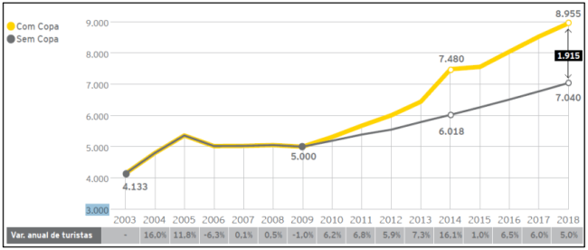 Em estudo realizado pela Ernest & Young (2010), em parceria com a Fundação Getúlio Vargas, estimou-se a chegada de turistas internacionais com análise no contexto da época de crescimento econômico das economias emergentes, principalmente os chamados BRICS [Brasil, Rússia, Índia, China e África do Sul], associado aos investimentos em publicidade e informações relacionados à projeção da imagem do país por meio da Copa do Mundo FIFA 2014. As previsões eram também otimistas, comparando o crescimento com ou sem a realização de tal megaevento esportivo, conforme se mostra no gráfico 2 a seguir.