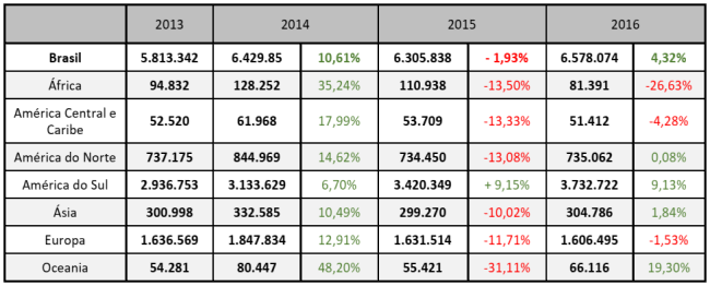 Ao analisar os dados obtidos pelo Anuário Estatístico de Turismo dos últimos três anos, com objetivo de delimitar as chegadas de turistas ao Brasil, percebe-se que comparativamente ao ano anterior houve um aumento de 10,61% no número de turistas durante o ano da realização da Copa do Mundo FIFA 2014 [especialmente argentinos e norte-americanos] e de 4,32% durante o ano de realização das Olimpíadas de Verão Rio 2016. O número absoluto, porém, foi abaixo da meta estabelecida para tais anos, justificando-se, portanto, o destaque.