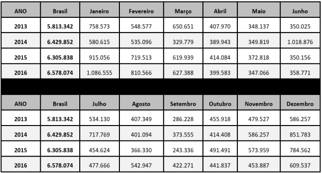 Também para analisar se os megaeventos esportivos atraíram maior número de turistas, apresenta-se no Quadro 5 o número de visitantes mensais desde o ano de 2013 até o ano de 2016, notando-se que a Copa do Mundo de 2014, realizada entre os meses de junho e julho, fez com que o Brasil recebesse 1.736.645 visitantes internacionais. Tal cifra representa quase o triplo comparativamente aos mesmos meses do ano de 2013, ressaltando-se, porém, que esse aumento foi eventual e não se manteve ao longo do tempo. Vale destacar que a expansão do número de turistas estrangeiros no Brasil é um dos maiores anseios dos gestores públicos e privados da atividade e um dos pontos mais questionados nas análises dos especialistas do campo socioeconômico do turismo nacional. A expectativa seria de que esse aumento proporcionaria significativos benefícios para a cadeia produtiva setorial, em função de ingresso de divisas, do aumento das taxas médias de ocupação dos serviços e da geração de emprego e renda. Os megaeventos esportivos foram considerados a estratégia absoluta e eficaz para essa conquista, pois a sua realização seria a garantia suficiente para a mudança conjuntural da atividade, com impactos sobre toda a economia nacional.