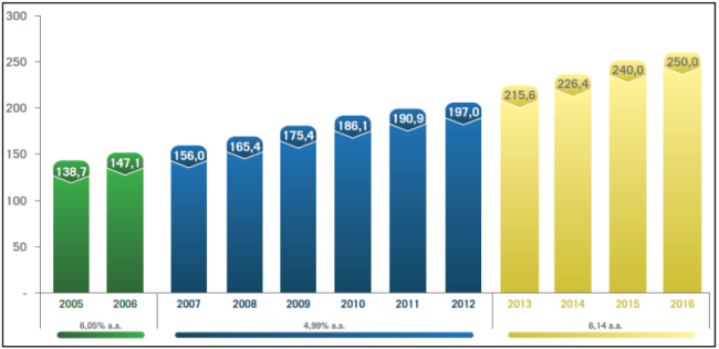 No PNT, a justificativa para a pretensão da meta 3 [aumentar para 250 milhões o número de viagens domésticas realizadas até 2016] é caracterizada pelo avanço da infraestrutura turística [mesmo que de maneira não delimitada pelo estudo] decorrente, principalmente, dos megaeventos esportivos, aliados à equanimidade distributiva e à gestão descentralizada. No Gráfico 4, verifica-se a estimativa prevista para o número de viagens.