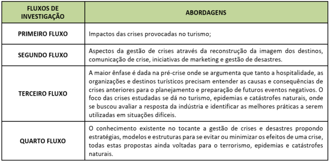 Conforme exposto, cada crise é única, os contextos diferentes e a forma de percepção varia, de gestor para gestor, cabendo, contudo, ter um profundo conhecimento da área de atuação, possuindo discernimento para adotar a estratégia que melhor se adéque à situação encontrada. Estudos realizados por Paraskevas e Altinay (2013) apresentam uma preocupação na identificação dos impactos provocados pelo turismo, no entendimento de suas causas assim como em algumas medidas tomadas pelos destinos diante de uma possível situação de crise, dividindo a crise em 04 abordagens de fluxos de investigação. Ressalta-se que estes estudos já destacam o gerenciamento de crises voltadas para o terrorismo, epidemias e catástrofes naturais, conforme Quadro 1.