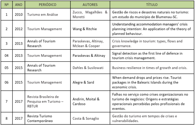 Os estudos pesquisados compreendem ocorrências entre os anos de 2010 e 2017, considerando o crescimento no número de publicações em função do aumento de incidências no mercado. A busca foi realizada nos portais digitais dos periódicos, acessados por meio das bases de dados Periódicos Capes e Science Direct. Nela foram utilizadas como chaves de busca <crisis management in tourism> e <issue management in tourism>, nos periódicos estrangeiros. Para os periódicos brasileiros utilizou-se de pesquisas manuais, visto que através das chaves de busca não foram obtidos os resultados esperados. A busca inicial identificou, a partir das palavras chaves, 47 periódicos. Após leitura sistemática levando em consideração as categorias de análise [<conceitos de crise utilizados>; <tipologia>; <processo de desenvolvimento> e <procedimentos de prevenção e/ou combate>, foram selecionados 8 que abordavam pelo menos uma das categorias propostas. Estes estudos contemplam, principalmente, destinações e o ramo de hotelaria e se concentram, em sua maior parte, nas publicações de revistas estrangeiras, com destaque para a Tourism Management. Das sete revistas brasileiras, apenas a Turismo em Análise, RBTUR e Turismo Contemporâneo apresentaram resultados de acordo com as variáveis selecionadas.