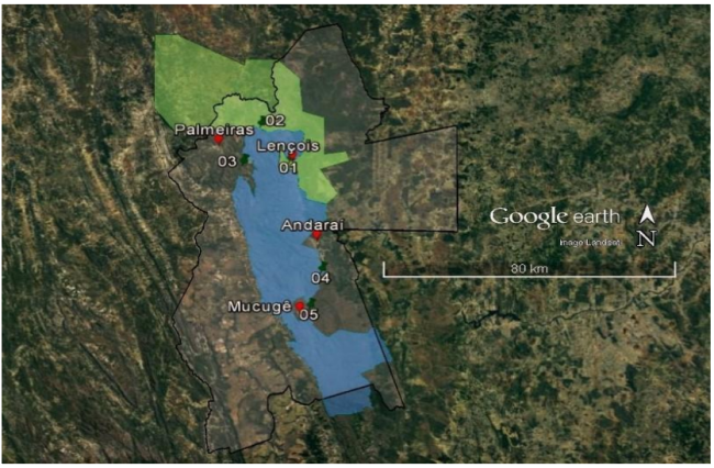 O polígono verde representa a APA Marimbus Iraquara e o polígono azul representa o PARNA Chapada Diamantina. As demais UC, com áreas muito inferiores, são representadas pelos marcadores verdes e listadas a seguir: (1) Parque Municipal de Lençóis; (2) Parque Municipal do Pai Inácio; (3) Parque Municipal do Riachinho; (4) Parque Urbano de Preservação Histórico Ambiental e de Lazer de Igatu; (5) Parque Municipal de Mucugê.