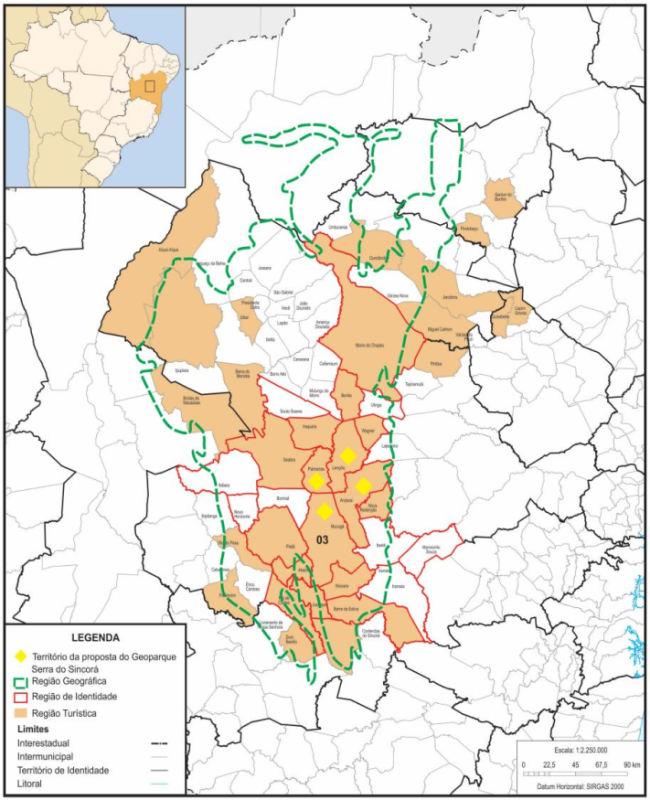 CPRM (2017).Chapada Diamantina e território do Geoparque Serra do Sincorá - É importante registrar que a Chapada Diamantina possui três formas diferentes de compreensão em função do significado dos termos Chapada Diamantina: uma como território de identidade da Bahia, definido pelo governo local, sobre o sentimento de pertencimento da população local (Decreto 12.354, de 25.08); outra, como região geográfica que considera a formação geológica e geomorfológica (Pereira, 2010); e outra, definida pelo Ministério do Turismo como região turística (Mtur, 2016) [Fig. 3]. Considerando um olhar holístico para a área do futuro Geoparque, o projeto do Geoparque Serra do Sincorá está compreendido dentro de diferentes significados. Entende-se que o desenvolvimento do turismo é de suma importância para este território; o desenvolvimento social, econômico associado à identidade da comunidade local, sem desconsiderar sua história, faz parte da composição conceitual de um Geoparque; além disso, é necessário que as características geológicas e geomorfológicas sejam relevantes. Espera-se que a gestão do Geoparque seja capaz de articular e englobar esses olhares para produzir resultados satisfatórios para a comunidade, a economia e a educação.
