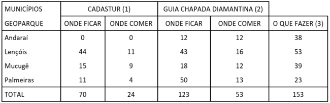 Lençóis se estabelece enquanto principal localidade para o turismo, uma vez que possui a maior quantidade de produtos turísticos [Quadro 1], sendo também apontada pela categorização do Ministério do Turismo como principal cidade da região e responsável pela articulação do turismo (MTur, 2017-2019), uma vez que recebe mais turistas estrangeiros, domésticos, tem a maior quantidade de meios de hospedagem de empregabilidade da comunidade nos mesmos. De acordo com a Cartilha de Categorização (MTur, 2016), o objetivo é categorizar os municípios em função da economia do turismo a partir desse instrumento, visando que a gestão pública tenha resultados para gerenciar políticas públicas para o turismo. Dentre os demais municípios abrangidos pela proposta do Geoparque, Mucugê e Palmeiras estão categorizados com a letra C e Andaraí com a letra D. Essa categorização significa que são cidades que possuem pouca atratividade de turistas estrangeiros, baixa empregabilidade e número de meios de hospedagem.