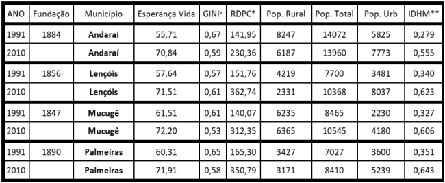 As Autoras, a partir de Atlas de Desenvolvimento Humano no Brasil (2010).Entre 1991 e 2010, os dados econômicos sociais dos quatro municípios no que se refere à esperança de vida ao nascer e o IDHM mostraram uma significativa ampliação [Quadro 2]. Observa-se, ainda, redução da população rural em Andaraí (24,97%), Palmeiras (7,47%) e Lençóis, com um êxodo rural de 44,74%. No município de Mucugê, a população rural aumentou em 2,08%. Houve incremento da população urbana nos quatro municípios, sendo Lençóis (56,68%) e Mucugê (46,31%) os municípios aonde as cidades receberam maior contingente populacional num período de 19 anos. Por outro lado, o que chama atenção é que, apesar das melhorias sociais citadas, o Índice de Gini, que mede a diferença social, cujo valor ideal se aproxima de zero e o pior valor é um, em Lençóis há uma diferença de 0,57 para 0,61 indicando uma piora neste aspecto, enquanto Mucugê apresenta melhora de 0,08 pontos para esse índice e, Palmeiras, 0,07 pontos [Quadro 2]. Analisando a renda per capita média, em todos os municípios houve melhora, entretanto, em Lençóis, Mucugê e Palmeiras, essa foi maior que o dobro no período de 1991 a 2010. O município de Andaraí, o mais populoso dentre os quatro, apresenta a mais baixa esperança de vida e a menor renda per capita, consistindo-se em uma região que necessita de políticas públicas para melhorar a qualidade de vida de sua numerosa população, o que pode ser observado pelo Índice de Desenvolvimento Humano Municipal [IDMH]. A concepção do turismo, trazido pela Rede de Geoparques, é que as áreas dos parques se proponham a integrar e articular a comunidade local econômica e socialmente, considerando sua história e trabalhando de forma a que todos tenham a possibilidade de acesso ao desenvolvimento econômico e social, sem perda da identidade local.
