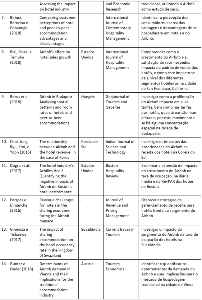 Com este trabalho buscamos estimular estas contribuições com base em outras perguntas que encontramos na trajetória deste trabalho, e que por restrições de recursos, não puderam ser respondidas. A primeira lacuna encontrada nesta revisão sistemática digna de citação é o fato de que, dos 35 artigos recuperados em nossa revisão sistemática, nenhum deles tratou da relação do Airbnb com o mercado de meios de hospedagem na América Latina ou no Brasil. Considerado um fenômeno mundial que suscita discussões por países que possuem considerável demanda turística, é surpreendente a escassez de pesquisas acerca do Airbnb e seus efeitos oriundas de um país com dimensões continentais e que possui destinos consagrados internacionalmente como o Rio de Janeiro. Portanto, torna-se impreterível a participação da comunidade acadêmica brasileira, em especial os pesquisadores de turismo, na exploração deste contexto e na contribuição de conhecimento categórico para o mercado, os planejadores do turismo e a sociedade em geral.