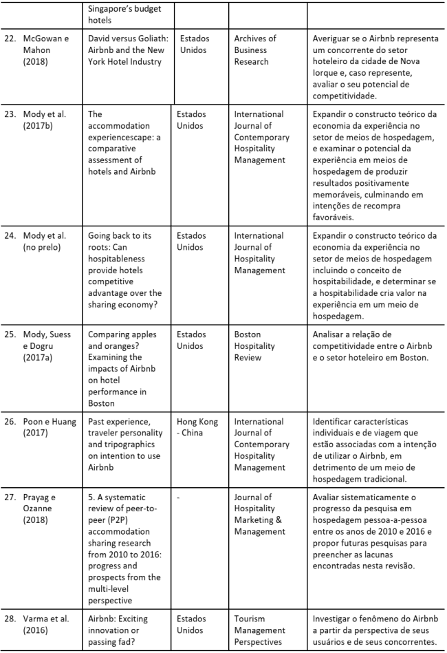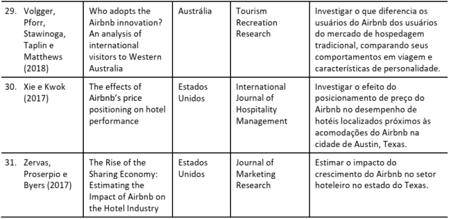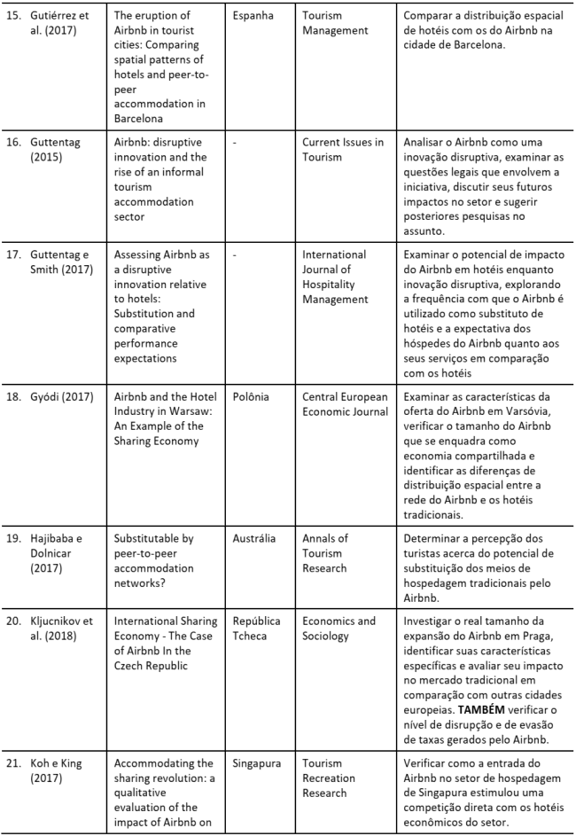 Analisando o Quadro 1, podemos perceber que os trabalhos identificados nesta etapa foram publicados em inglês, embora sejam provenientes de diversos países do mundo. Ainda assim, a grande maioria dos trabalhos foi realizada em países desenvolvidos, com a exceção do trabalho de Ginindza e Tichaawa (2017), que será comentado mais à frente. Alguns países são frequentes contextos nestes estudos, como é o caso dos Estados Unidos e da Espanha, provavelmente pelo fato de o primeiro ser grande referência em estudos da hospitalidade comercial, e o segundo ser um evidente exemplo dos desdobramentos do Airbnb em seu território, destacando-se a cidade de Barcelona (Gutiérrez et al., 2017). É válido ressaltar a expressão de periódicos altamente classificados em nossos resultados, como o Annals of Tourism Research, Tourism Management, Current Issues in Tourism, dentre outros.