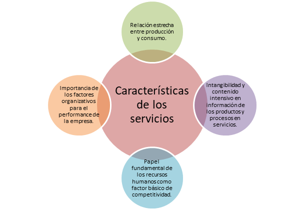 Tal y como se observa en la figura anterior, una de las características propias de los servicios es la relación estrecha entre producción y consumo, es decir, en la mayoría de los servicios la producción y consumo, o prestación es in situ y ocurren al mismo tiempo, así, se hace del proceso de innovación una actividad interactiva entre los consumidores -clientes- y los oferentes. Por su parte, el uso imprescindible de TIC en las actividades de innovación es de vital importancia para un mejor desempeño, ya que las TIC pueden conformar plataformas tecnológicas para diseñar, comercializar y producir nuevos servicios o productos. En cuanto el rol de los recursos humanos como factor básico de competitividad, es el personal un elemento básico y diferenciador capaz de aportar ventajas competitivas a la empresa por medio de sus competencias -conocimientos, habilidades y actitudes- al ofertar un servicio de calidad. En último lugar, se encuentran los factores organizativos que, se componen de las competencias y estrategias empresariales: conocimiento de los mercados, capacitación de sus empleados, alianzas y certificaciones, entre otros. Estos factores también son conocidos como capacidades organizacionales y favorecen la generación de innovaciones.
