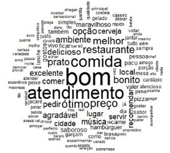 O ambiente é outro aspecto que a literatura aponta como altamente valorizado pelos clientes e a nuvem de palavras corrobora que ‘ambiente’, ‘local’ e ‘lugar’ são usados para caracterizar a atmosfera do restaurante. Mais discreto, mas também lembrado, foi o ‘ao vivo’, que indica um gosto do turista em fazer suas refeições ao som de um cantor ao vivo, como detalha o comentário “Lugar agradável, porém, achei a porção um pouco pequena para o valor. Música ao vivo boa. Atendimento razoável.” O preço, embora menos encontrado na literatura como um atributo importante, se fez presente na análise da nuvem de palavras, ainda que apenas pela nuvem não seja possível saber se de forma elogiosa ou não, o valor pago foi alvo das resenhas online, como neste comentário: “Restaurante familiar com um preço bom e uma comida com gostinho de casa, excelente para almoço pós passeios.”