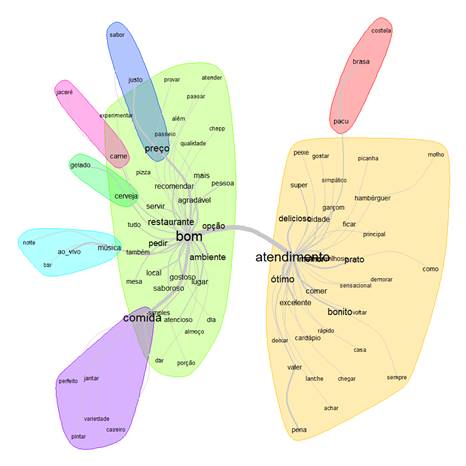 O adjetivo ‘bom’ está relacionado com aspectos bem gerais, como ‘restaurante’, ‘almoço’ e ‘qualidade’, e a outros cinco clusters que apresentam ‘preço’ com o termo ‘justo’ mais diretamente ligado; ‘carne’ e o representante mais famoso das consideradas carnes exóticas, a de ‘jacaré’; ‘cerveja’ e ‘gelado’; ‘música’ mencionada com o ‘ao vivo’; e por fim, ‘comida’, destacada pela ‘variedade’ e o sabor ‘caseiro’. O último cluster na parte direita superior é sobre o Pacu, peixe da região, feito na ‘brasa’ e geralmente apresentado com os cortes sob a forma de ‘costela’: “O pacu na brasa deve ser apreciado, bem como a costela que desmancha na boca, os pratos são de tamanho excelente […].”