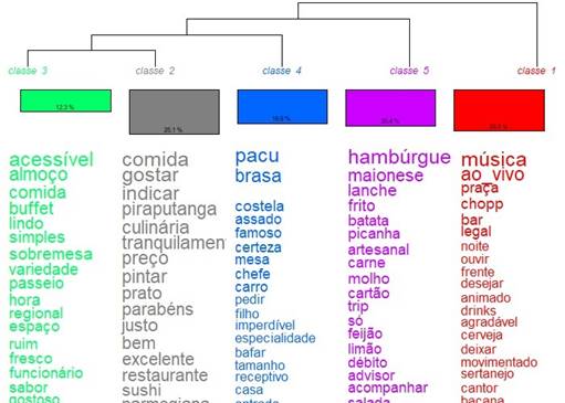 As classes 4 e 5, embora tratem de pratos, estão a uma certa distância dentro do texto. A coluna 4 é completada pela culinária que pode ser considerada como local, por isso são vistos os termos ‘Pacu’, ‘brasa’ e ‘costela’, logo no início. Já a classe 5 é de alimentos mais comuns a qualquer parte do Brasil e do mundo, ‘hambúrguer’, ‘lanche’, ‘batata’ e ‘picanha’. A distância entre as duas colunas é justificada pelo de que nos comentários, em geral, ou a pessoa optou pelos pratos típicos da região, ou não quis se aventurar e buscou experiências diferentes em pratos mais tradicionais, como o ‘hambúrguer’. Dois recortes [verbatins] ajudam a entender essa distinção: “Foi uma excelente refeição, o hambúrguer é muito bem feito e o preço é justo. Basicamente o cardápio consiste em alguns hambúrgueres e cada um deles é servido com cinco maioneses diferentes […]”, e: “O Pacu na brasa é provavelmente o melhor peixe que já comi. Vale muito a pena.”