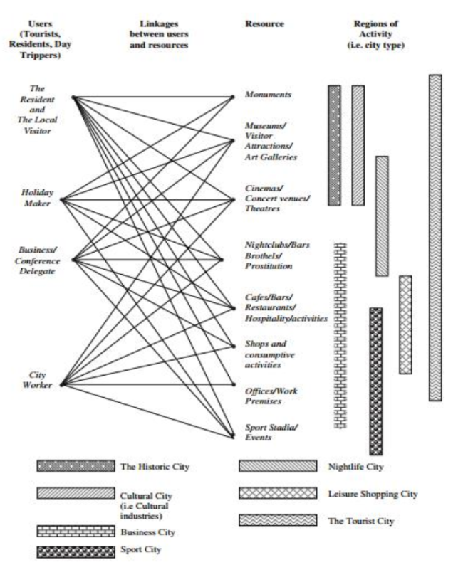 Conforme Acerenza (2006), o turismo não se limita ao mercado do lazer, como também cobre o conjunto mundial de viagens, dentro do marco da mobilidade populacional definido como as atividades realizadas durante a permanências em lugares distintos do seu entorno habitual, por um período consecutivo inferior a um ano, com fins de lazer, negócios entre outros motivos. Dentre as destinações turísticas, as cidades destacam-se como locus de turismo devido ao mix de atrações ofertado, como entretenimento e outras facilidades de lazer. No entanto, não será apenas para turistas que as estruturas e facilidades urbanas terão frequência e utilização, mas também pela população local, por visitantes a negócios ou por visitantes de um dia, gerando contato entre os de fora com os de dentro da cidade [Fig.1] (Ashworth & Page, 2011; Fistola & La Rocca, 2017).