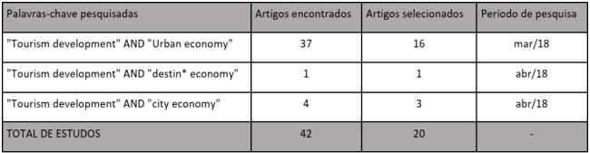 O presente estudo, conforme já descrito, buscou compreender os efeitos do desenvolvimento turístico sobre o ambiente econômico urbano, por meio de pesquisa bibliográfica na base de dados Scopus. As pesquisas foram realizadas entre os meses de março e abril do ano de 2018, conforme descrito no quadro a seguir, no qual se observam as palavras-chave utilizadas para buscas no sistema, a quantidade de artigos obtidos e a quantidade de papers selecionados para análise.