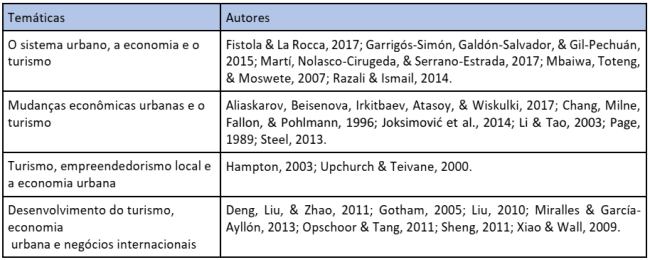 A análise temática dos estudos coletados permitiu a divisão dos resultados em quatro seções distintas, apesar da temática em comum ‘desenvolvimento do turismo urbano e ambiente econômico’, sendo elas: sistema urbano, a economia e o turismo; mudanças econômicas urbanas e o turismo; turismo, empreendedorismo local e economia urbana; desenvolvimento do turismo, economia urbana e negócios internacionais. No Quadro 2 observa-se a distribuição anual por divisões temáticas dos estudos coletados, totalizando-se um intervalo temporal de 28 anos, com artigos datados de 1989 até 2017 sendo, portanto, os anos de 2011, 2013 e 2017 aqueles que apresentaram maior representatividade, com três artigos cada. Das quatro seções temáticas de estudo, destaca-se ‘desenvolvimento do turismo, economia urbana e negócios internacionais’ com 7 estudo coletados, seguida das seções ‘mudanças econômicas urbanas e o turismo’ com 6 papers selecionados. No Quadro 3, observa-se a divisão dos estudos por cada uma das seções temáticas propostas.
