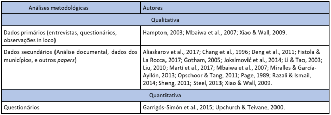 Metodologicamente, os artigos são caracterizados como estudos de casos, haja visto buscarem estudar e compreender a realidade em que seus autores estivessem inseridos, representando o processo de desenvolvimento do turismo e as reações econômicas [assim como sociais e culturais] da cidade ao fenômeno. No Quadro 3 observa-se que, na maior parte das pesquisas analisadas a opção foi pela realização de estudo qualitativo, utilizando-se dados secundários, tais como dados estatísticos de órgãos oficiais, documentos de estudos de qualidade de vida, de recursos econômicos, como mapas, e outros dados diversos, totalizando-se 20 artigos. Dentre os 20 artigos associados ao método qualitativo com dados secundários, Hampton (2003), Mbaiwa et al. (2007) e Xiao e Wall (2009) também incluíram em seus estudos a busca por dados primários por meio de instrumento semiestruturado de pesquisa e entrevista, estando presentes, também, no quadro de dados primários.