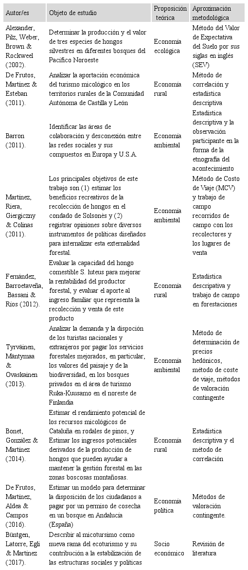 En otro sentido, existen trabajos asociados al valor específico de especies particulares de hongos, apoyados en las metodologías de la Tasa Interna de Retorno [TIR], el Valor Actual Neto [VAN] y el Valor Económico del Suelo [VES], tal es el caso del estudio desarrollado por Fernández, Barroetaveña, Bassani y Ríos (2012). La particularidad del estudio prevalece en la coexistencia entre especies altamente apreciadas y la motivación del turista, en el que se evaluó el papel del hongo S. Luteus en el mejoramiento de la rentabilidad del producto forestal, así como su aporte al ingreso familiar mediante su recolección y venta. Asumiendo que la fructificación es variable, asociada principalmente a las precipitaciones y al manejo de la densidad forestal, resultando solamente conveniente en los sitios con mayores productividades.