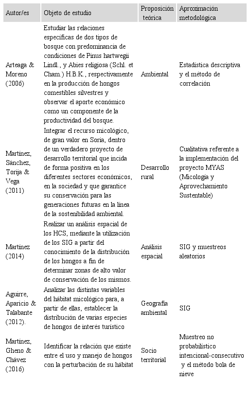 Por su parte Martínez, Gheno y Chávez (2016) identificaron la relación que existe entre el uso y manejo de los hongos con la perturbación de su hábitat. Para ello aplicaron una encuesta mediante un muestreo no probabilístico intencional-consecutivo, a recolectores y vendedores de hongos, para tener un acercamiento a los factores: socioeconómicos, antrópicos, socioterritoriales y naturales. Reconocen que la recolección de hongos es una actividad económica alterna y complementaria a las actividades primarias y secundarias. El promedio de hongos que recolectan es de 9 kilos por día. Durante la temporada de hongos, los recolectores obtienen un ingreso del 40% en comparación con su ingreso anual. De manera que la tala de árboles, la actividad extractiva de recursos forestales no maderables y la disminución de la materia orgánica son actividades antrópicas que han contribuido en la disminución de 36 especies silvestres.