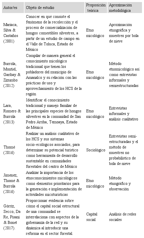 Thomé (2016) realizó un análisis cualitativo de los HCS y sus sistemas socio-ecológicos asociados, para determinar su potencial turístico como herramienta de desarrollo sustentable en comunidades forestales del centro de México. El trabajo consistió en un estudio de caso donde se realizó revisión de literatura y la aplicación de entrevistas semiestructuradas a informantes clave. Destaca la importancia identitaria de los HCS dentro de la sociedad, en la que el conocimiento etnomicológico es adquirido y heredado, realizada principalmente por mujeres quienes también se hacen cargo de la elaboración de platillos en los cuales los hongos son el principal ingrediente. Sin embargo, existen limitantes en cuanto a la planificación y ejecución de la recolección, puesto que los HCS son recursos altamente sensibles a los factores meteorológicos y antrópicos.