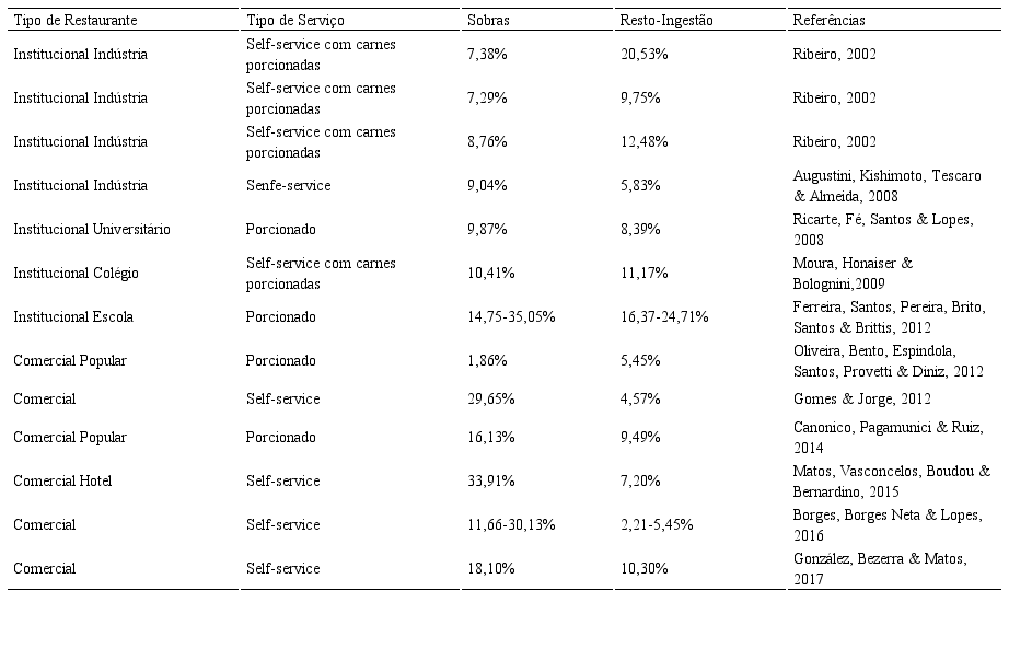 Para a elaboração da Tabela 1, comparativa, foram pesquisados artigos científicos que apresentavam valores de percentual de sobras e índice de resto-ingestão em estabelecimentos do tipo restaurante, tanto institucionais quanto comerciais. Foram desconsiderados os estudos de intervenção sobre os valores destes índices, como aqueles em que eram realizadas ações de Educação Alimentar e Nutricional ou de Educação Ambiental para reduzir o desperdício de alimentos, de modo a se evitar a apresentação de resultados tendenciosos e a padronizar o critério de seleção (pois não haveria um critério claro para a escolha de resultados antes ou após as intervenções). Além disso, foram considerados apenas os valores referentes a refeições distribuídas no almoço e se considerou como sobras todos os alimentos produzidos, mas não servidos (incluindo aqueles que foram disponibilizados para distribuição), ou seja, não foi feita distinção entre sobras sujas e sobras limpas.