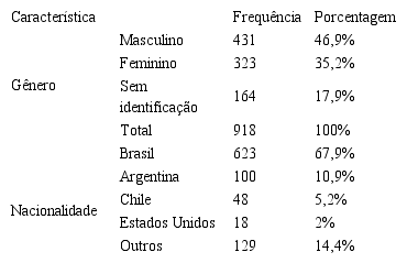 O estudo se propôs a analisar as avaliações negativas de hospedagens no Booking das duas principais cidades turísticas de lazer no Brasil, Rio de Janeiro-RJ e Florianópolis-SC, avaliando os hotéis com classificação de 1 a 5 estrelas. Para isto, é necessário conhecer o perfil das pessoas que fizeram parte dessa análise. A seguir são apresentados alguns resultados do estudo. Quanto às características dessa amostra, ela foi dividida em gênero e nacionalidade. Nota-se que a maior proporção de respondentes é do sexo masculino, representando 46,9% da amostra, seguida pelo sexo feminino (35,2%) e pelos comentários sem identificação nominal (17,9%). Dentro do critério de nacionalidade, o Brasil se destaca com 67,9% de respondentes, seguido de Argentina (10,9%), Chile (5,2%) e Estados Unidos (2%). Outras nacionalidades representam 14,4% dos comentários.