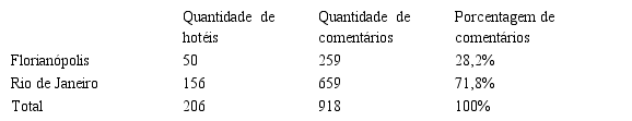 A quantidade de hotéis nas cidades de Florianópolis e Rio de Janeiro que receberam algum tipo de comentário durante o período analisado e a quantidade de comentários que cada localidade recebeu são apresentadas na Tabela 2. Ao todo, 156 hotéis do Rio de Janeiro receberam algum tipo de comentário negativo muito ruim no período analisado, enquanto em Florianópolis o número foi de 50 hotéis. O número de hospedagens no Rio de Janeiro é proporcionalmente maior devido à representação turística da cidade, que é também o destino turístico mais procurado do Brasil. Nota-se então que o Rio de Janeiro recebeu um total de 659 comentários muito ruins no Booking durante o período, enquanto Florianópolis recebeu 259 comentários.