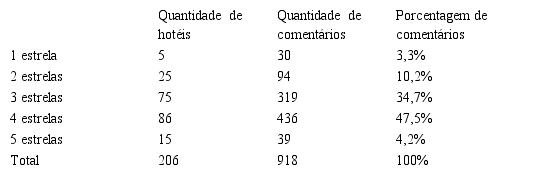 A quantidade de hotéis e comentários conforme a classificação de estrelas dos meios de hospedagem é apresentada na Tabela 3. Podemos observar que os hotéis classificados com quatro estrelas foram os que mais receberam comentários negativos representando 47,5% dos comentários analisados. Os hotéis com quatro estrelas também representam a maioria dos hotéis (41,75%) da pesquisa, sendo 86 hotéis analisados. Em seguida vem os hotéis de três estrelas, que receberam 319 comentários em 75 hotéis.