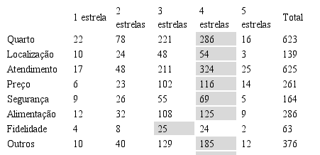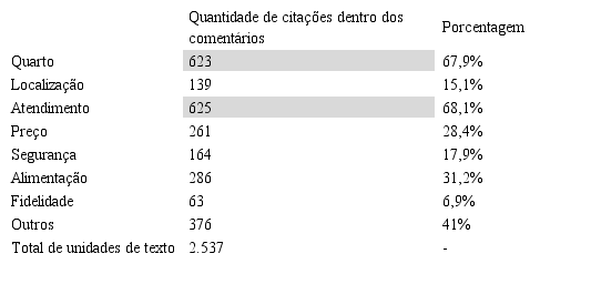 A categorização dos comentários para transformá-los em unidades de texto foi feita manualmente, analisando cada avaliação negativa e seu conteúdo para classificar conforme as oito categorias apontadas [quarto, localização, atendimento, preço, segurança, alimentação, fidelidade e outros]. Portanto, o processo de codificação do levantamento dos dados envolveu uma quebra desses 918 comentários em unidades de textos. Sendo assim, em algumas situações, um único comentário poderia destacar problemas no quarto, em serviços de alimentação e atendimento, ao mesmo tempo. Logo, esse comentário seria classificado nas três categorias. Por fim, a partir dessa categorização dos comentários, as 918 avaliações coletadas foram transformadas em 2.537 avaliações/unidades de texto. A partir disso, iniciou-se a análise dos resultados com estudos de frequência, percentuais e tabulações cruzadas.