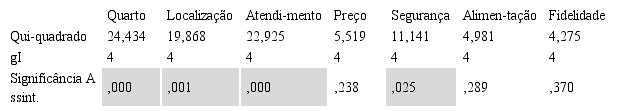 Conforme apresentado na Tabela 7, o resultado aponta que existem diferenças significativas entre as avaliações do quarto, da localização, do atendimento e da segurança, dependendo da quantidade de estrelas da hospedagem.