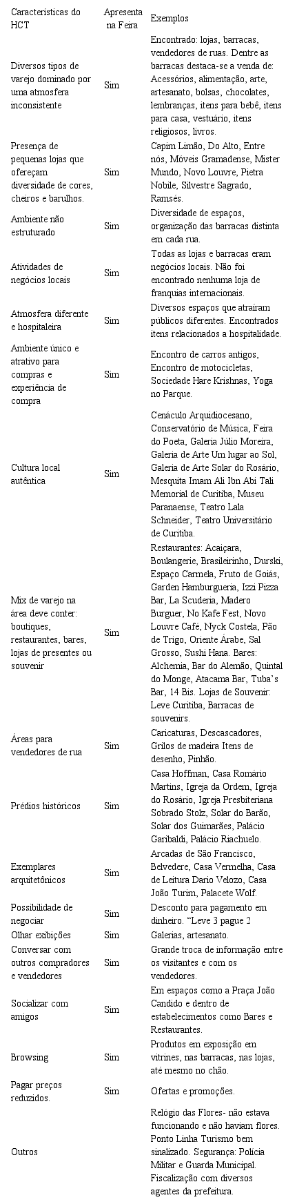 As informações levantadas através das pesquisas bibliográficas, documentais e in loco, mostraram que todos os itens que caracterizam o HCT dentro do trabalho de Yüksel (2007) foram encontrados na Feira do Largo da Ordem em Curitiba-PR. Demonstrando assim, que a Feira pode ser analisada como um Habitat de Compras Turística (HCT). No Quadro 1 percebe-se que a totalidade das características são positivas, sendo que a maioria delas apresenta mais de um exemplo. Um número significativo de estabelecimentos está ligado a Alimentos e Bebidas, como bares, restaurantes e souvenirs gastronômicos. Encontrou-se a venda na Feira do Largo da Ordem, uma quantidade expressiva de artesanato típico com o nome da cidade e com imagens de pontos turísticos.